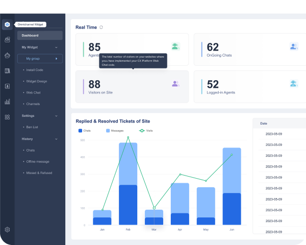 CloudFon provides a robust set of reports which focus on the data and metrics that matter most to your chat quality, agent performance, visitor satisfaction, tickets & messages volume so that you can make informed decisions for improvement; while the live dashboard allows you to see a 24X7 view of messaging, chats, tickets and agents status.